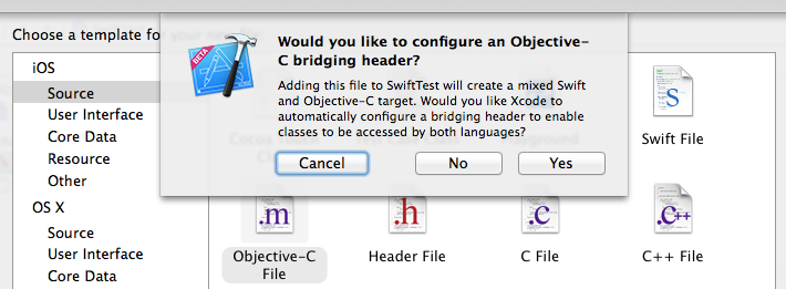 So, once you have create a new project with Swift as a language, add a Test.m file and press Yes on this dialog: