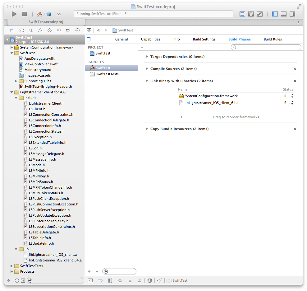 Note the bridging header and the imported headers and libraries in the Project Navigator, and the two libraries in the Build Phases panel. If you are using a 1.2.x version of the client library you will see fewer headers under the include group. That’s normal since 1.3 introduces new objects for mobile push notifications.